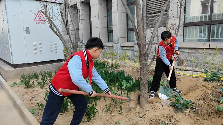 3月11日上午,在校领导和班主任的带领下,几十名学生代表兴致勃勃的在校园内除草植树,郑州市教科所胡远明主任、金水区教育发展研究中心校本课程教研员关春霞主任也来到学校陪同孩子们一起进行本次活动。他们拿着铁锹、水桶等劳动工具,分工协作,挖坑、填土、浇水,每个环节大家都一丝不苟,活动现场一片热火朝天的景象,成为春天又一道美丽的风景。