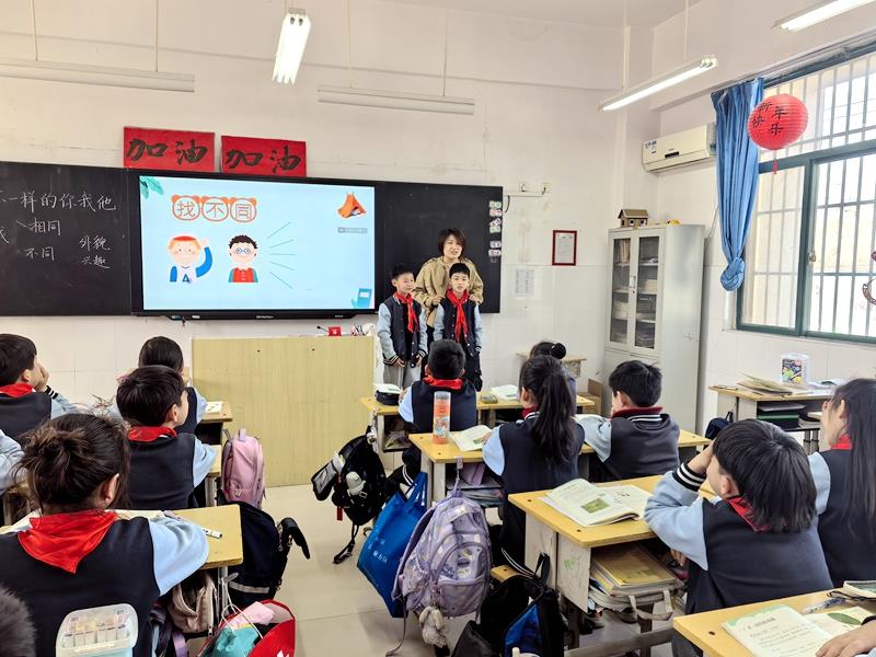在示范课环节,申青老师执教三年级《不一样的你我他》一课,以生动活泼的教学设计和富有感染力的教学风格,为学科教师呈现了一堂精彩的道德与法治示范课。申老师从学生的生活实际出发,通过"认识差异—接纳差异—欣赏差异"三个递进环节,引导学生理解并尊重个体差异,培养包容和欣赏他人的品质。