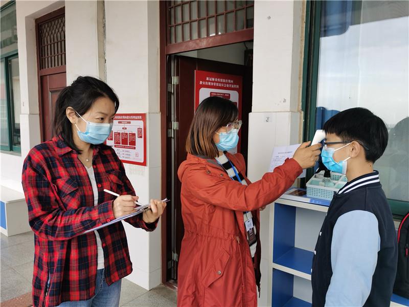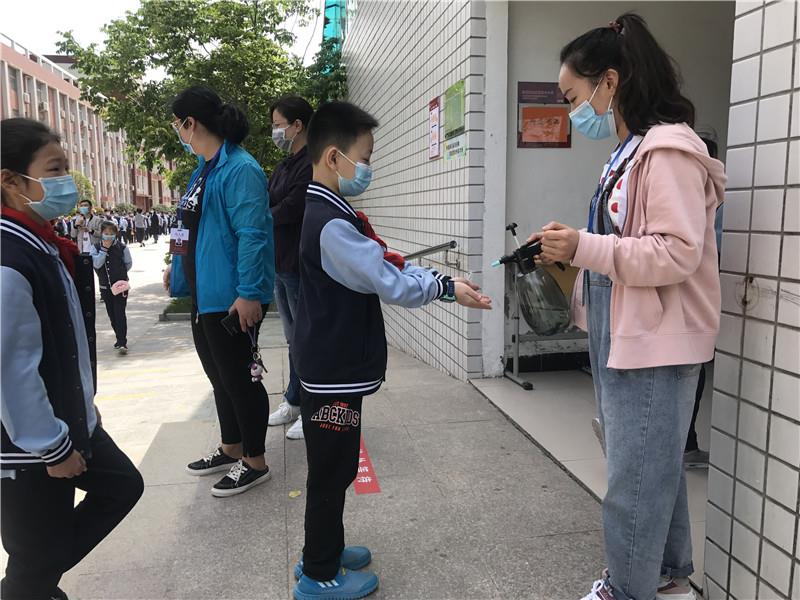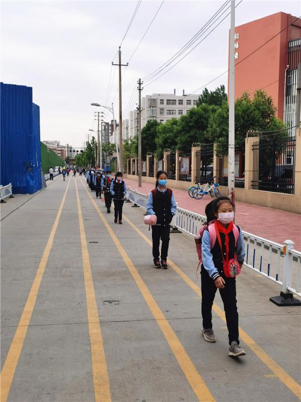 为避免人员聚集,学校采取分年级错时返校措施,高年级段在上午进行复学,低年级段在下午进行复学。孩子们在预定的时间段内,做到了按时返校。他们按照指引标志,间隔1米列队,依次有序地接受体温测试、有序入校。进入教室前,由各班正副班主任为孩子们进行二次测温并安全消毒,体温合格后方可进入。学校为安全复学做了各项准备工作,储备了数量充足、品种齐全的疫情防控物资。由于小学阶段的孩子年龄较小,为了让孩子们能够暖心、安心“回家”,学校精心为孩子们营造温暖的学习氛围。除此之外,在疫情防控的特殊时期,学校也将“防疫健康、敬畏生命”作为复学第一课的主题。