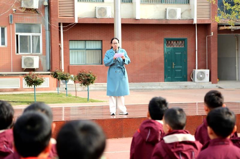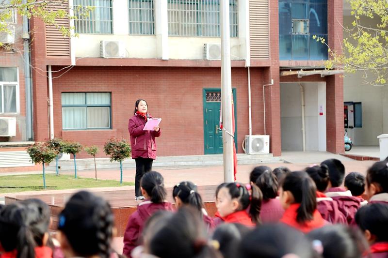中队辅导员代表张高霞老师做国旗下讲话,她从历史的角度阐述了清明节追思英烈的重要意义,鼓励同学们在缅怀中汲取力量,在传承中砥砺前行,以英烈为榜样,树立远大理想,培养坚韧不拔的意志。