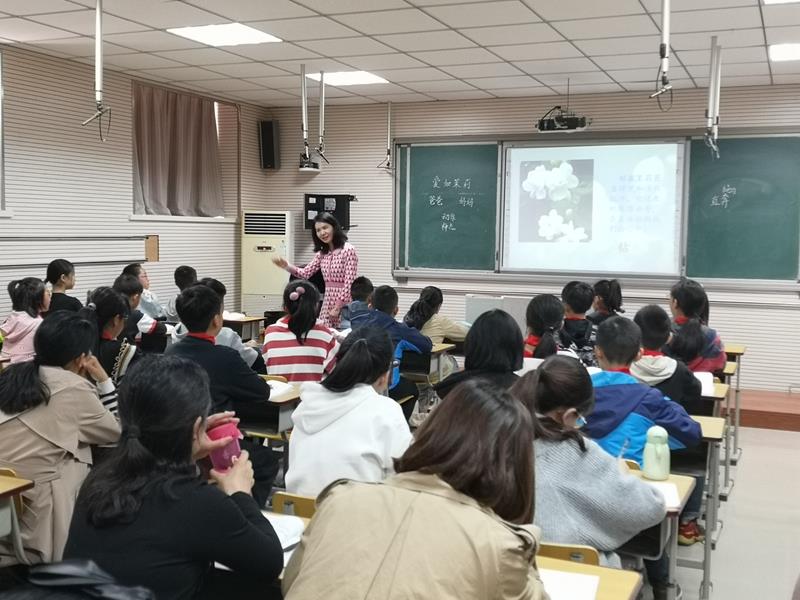 本次教研活动分“课例分享”、“业务学习”、“评课议课”、“总结反思”四个环节。首先由学校五年级的姚媛老师执教《爱如茉莉》一课,姚老师充分发挥教师主导地位和学生主体地位,引入对文本的感悟和朗读指导,品读重点词句,使“有感情地朗读”在这一年段目标落到实处。姚老师用亲切充满诗意的语言营造了轻松活跃的课堂气氛,认真的态度以及对教学的严谨规范足以展示良好的基本素质。课后,由五年级语文组杨一铭老师紧扣“关注细节 体会真情”这一主题,展示本组教研活动中业务学习内容。最后,参与教研活动的各组教师对课例进行了针对性的评课议课活动,肯定了姚老师课堂教学的可取之处,同时对不足之处予以客观评价。