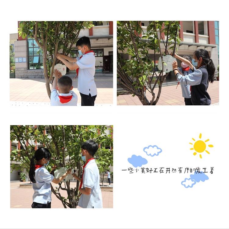 学校党员老师们也纷纷动手和孩子们一起挂树牌,清新醒目的树牌挂在一棵棵树上,仿佛在向行人微笑,形成一道靓丽的风景线。