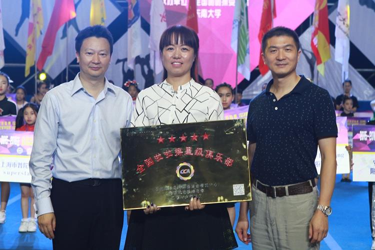 全国啦啦操委员会秘书长唐金山(右一)、全国啦啦操委员会执行副主任李育林(左一)向杨华主任授牌匾