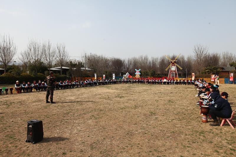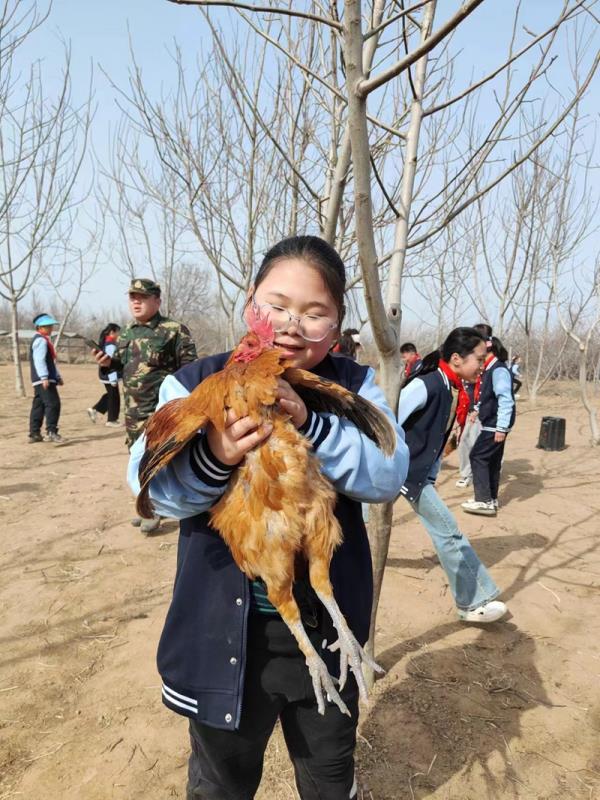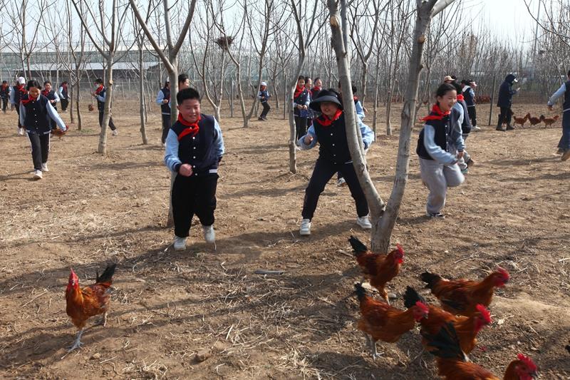 教官带领同学们前往“快乐逗鸡场”进行抓鸡游戏,同学们兴奋地奔跑着、尖叫着、快乐着……
