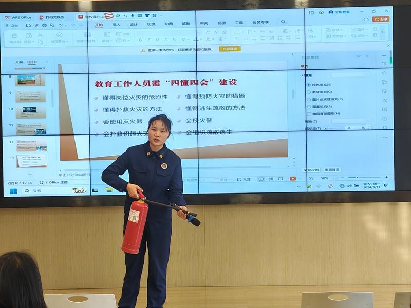 为进一步提高全体教师的消防安全知识及灭火技能,3月11日下午,艺术小学特邀请金水区消防救援大队郝教官为全体教师进行了一场消防知识安全培训,办公室主任李宝琛主持会议,并要求全体教师认真学习,强化安全意识。