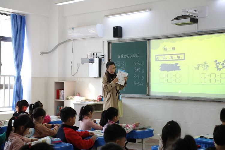 朱主任与学校多名教师共同聆听了胡慧芳老师的《跳绳(8的加减法)》一课,结合实际生活,用跳绳这一学生熟练的活动情境引出学习内容,提出数学问题,通过“说一说、摆一摆手”的教学环节,给予学生自主权,加深了学生们对“8”加减法的理解。