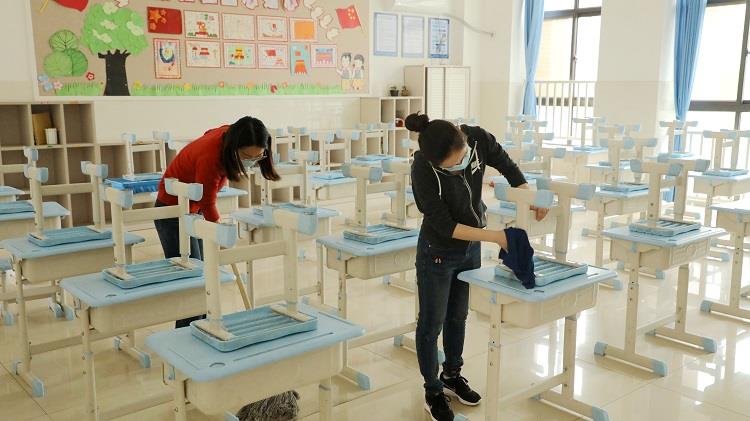 全体教职工分工合作,配合默契,对教室、办公室、校园公共活动场所等卫生进行全方位打扫清洗消毒,不留卫生死角,确保学校开学顺利进行。每一位教师事必躬亲,清扫教室每一个角落,对课桌、讲桌、书柜等教室公共区域进行消毒。认真清理教室地每一个死角,为孩子们创造卫生、安全、轻松地学习环境。